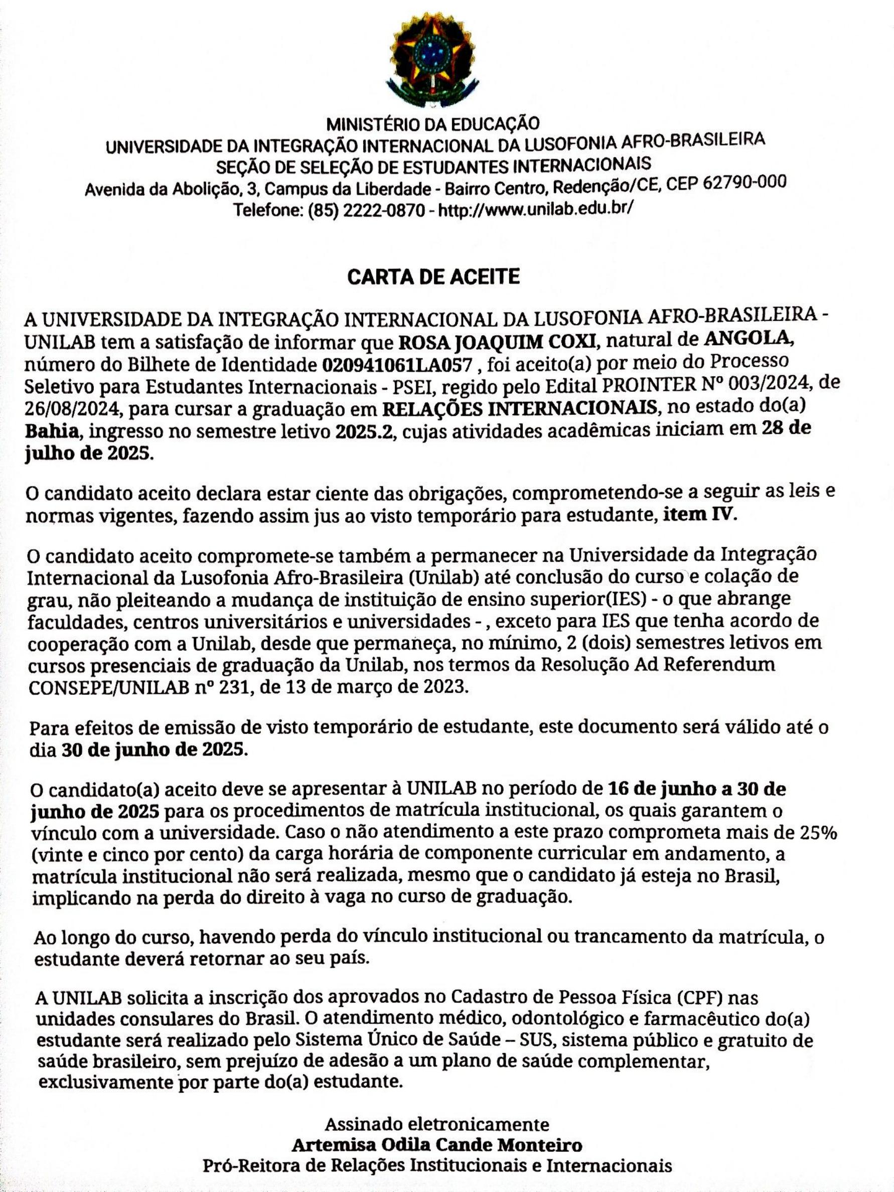 Acredito que a educação é um caminho viável para a transformação da minha realidade e para que, futuramente, possa dar o meu contributo ao desenvolvimento do meu país. Assim, reitero a minha solicitação, tendo em conta que o período de apresentação na universidade seria entre os dias 16 e 30 de Junho, mas graças a Deus , a universidade prorrogaram até dia 15 de Julho para chegar ao Brasil. Isso quer dizer que, tenho que chegar ao Brasil no início do mês de Julho. Peço com muita humildade que me ajudem a tornar o meu sonho em realidade.